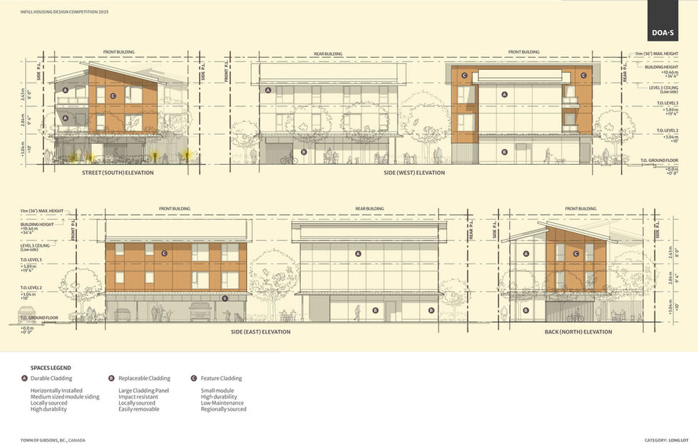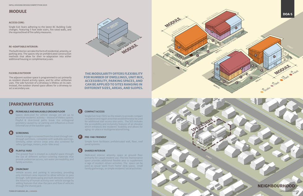 [PARK]WAY takes advantage of the latest changes to the BC Building code by incorporating Single Exit Stair cores that allow for floor area efficiencies, accessibility and inclusivity. The simple context-based architectural form permits the use of pre-fabricated building construction systems that allow for economical and material efficiencies. The form and organization of spaces permits for future additions or re-adaptations to plug-in as either prefab or on-site light wood frame construction.